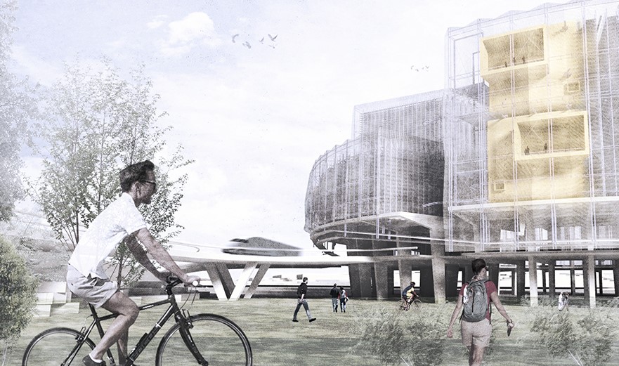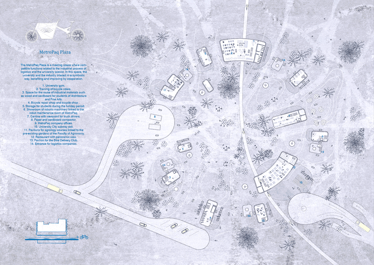 Freights are supplied and orders are shipped from highway and subway respectively. The proposed public square on the ground floor takes advantage of being on the University Campus, providing collaborative programs that are open to both the university and the logistics industry. This area incorporates supporting services for the students and the business workers, spaces for the reuse of industrial materials, sports spaces, and cargo bikes facilities linked to the transport network.